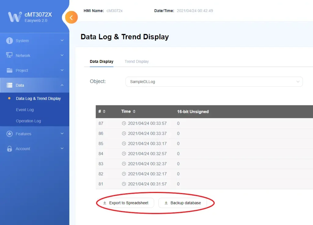 When connecting to your cMT-X Series through EasyWeb, you are able to export data logs, event logs, and operation logs as well as make backups of the database directly to your PC.