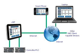 Many Maple Systems HMIs possess a VNC server (included at no additional cost) which allows them to be remotely monitored from a number of devices (laptops, desktop PCs, tablets, and cell phones (iPhone, Droid, Blackberry, or any other smart device with VNC client capability)).