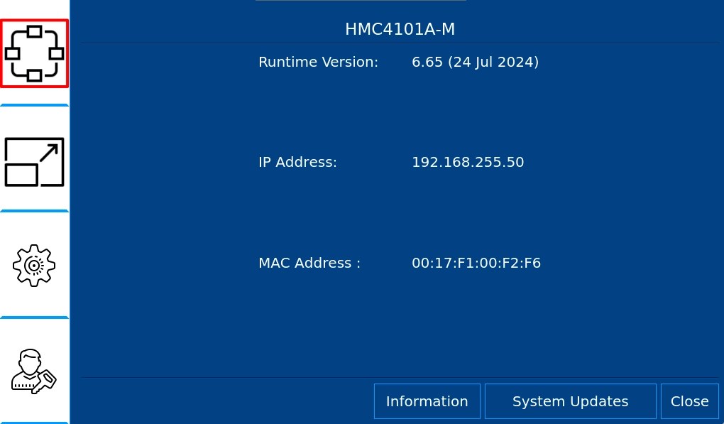 1. Now we’ll set our HMC’s IP address to something in the same subnet as our PLC. We’ll do this by pressing and holding the top-left corner of the HMC to go into the HMC system settings. Then we’ll click the “Network Settings” sidebar item.