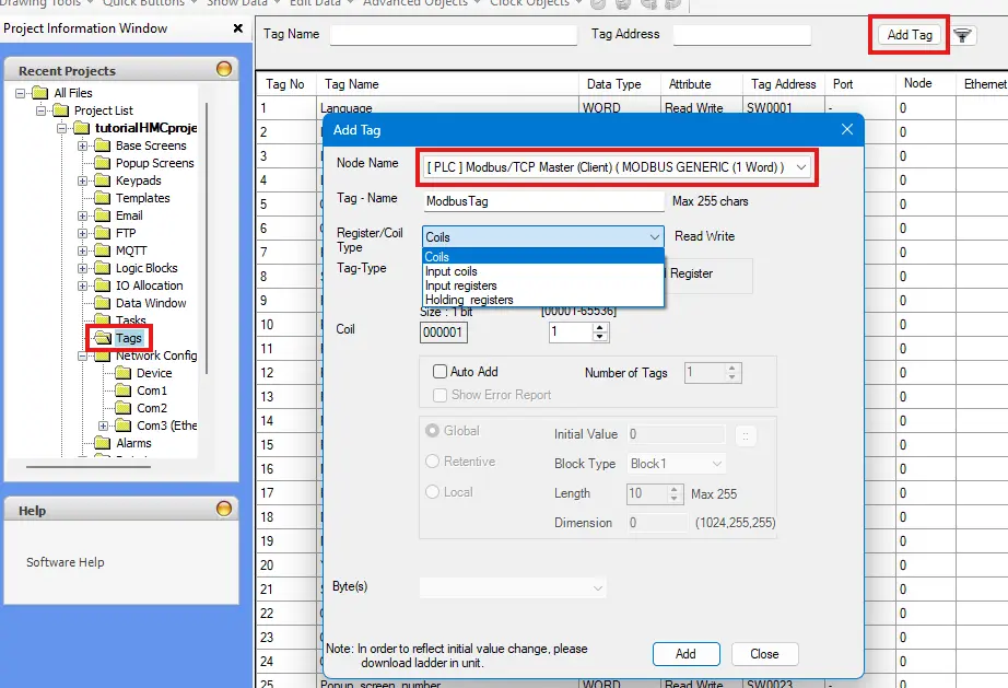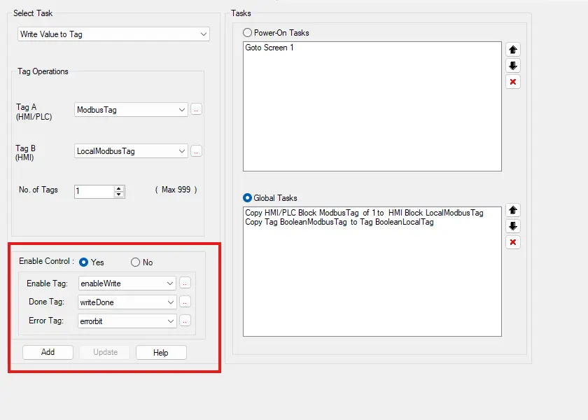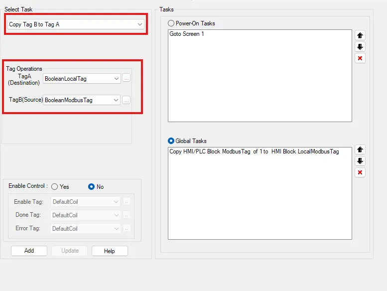 For a non-boolean “word” register, you’ll use the “Copy HMI/PLC Block to HMI Block” define which tags you’re transferring from and to, and click “Add” to add this task to your global task list