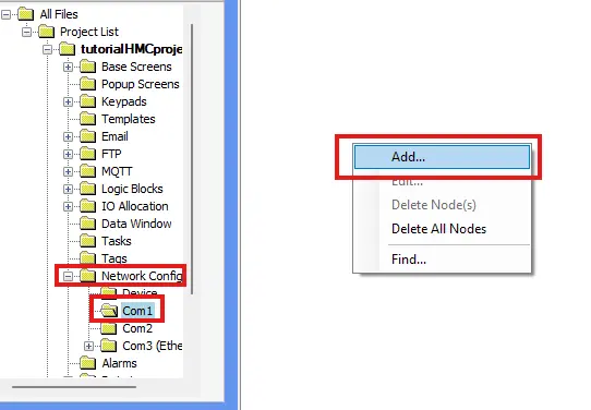 Then we’ll go to “Network Configuration > Com3 (Ethernet)” then we’ll right-click the page to add a new device connection.