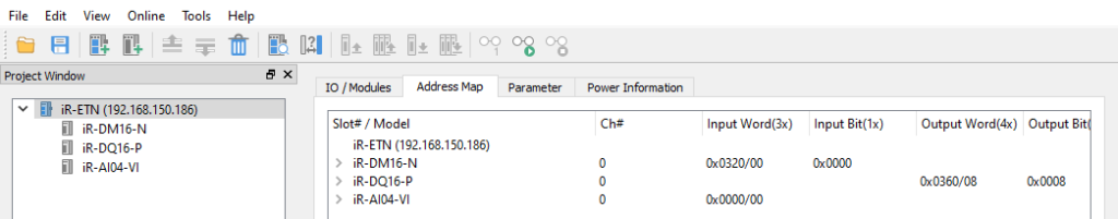 Confirm that Remote IO displays the iR-ETN and the connected module information in the project window.