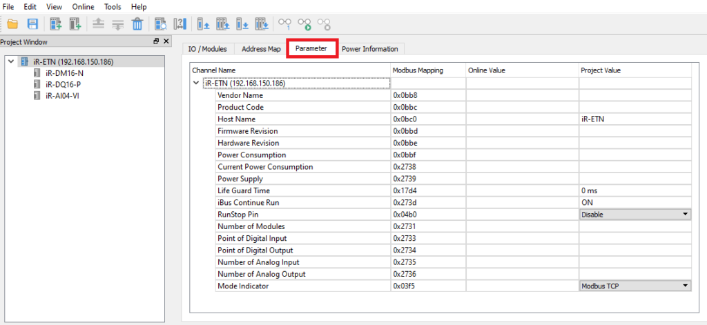 In the Project Window → Select the iR-ETN → Open the Parameter tab in the right column → Enter the new values in the Project Value column while reviewing the current values in the Online Value column.