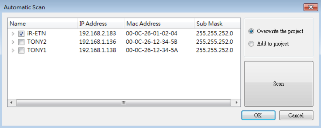 In the Automatic Scan window → Select the iR-ETN you want to configure → Click OK.