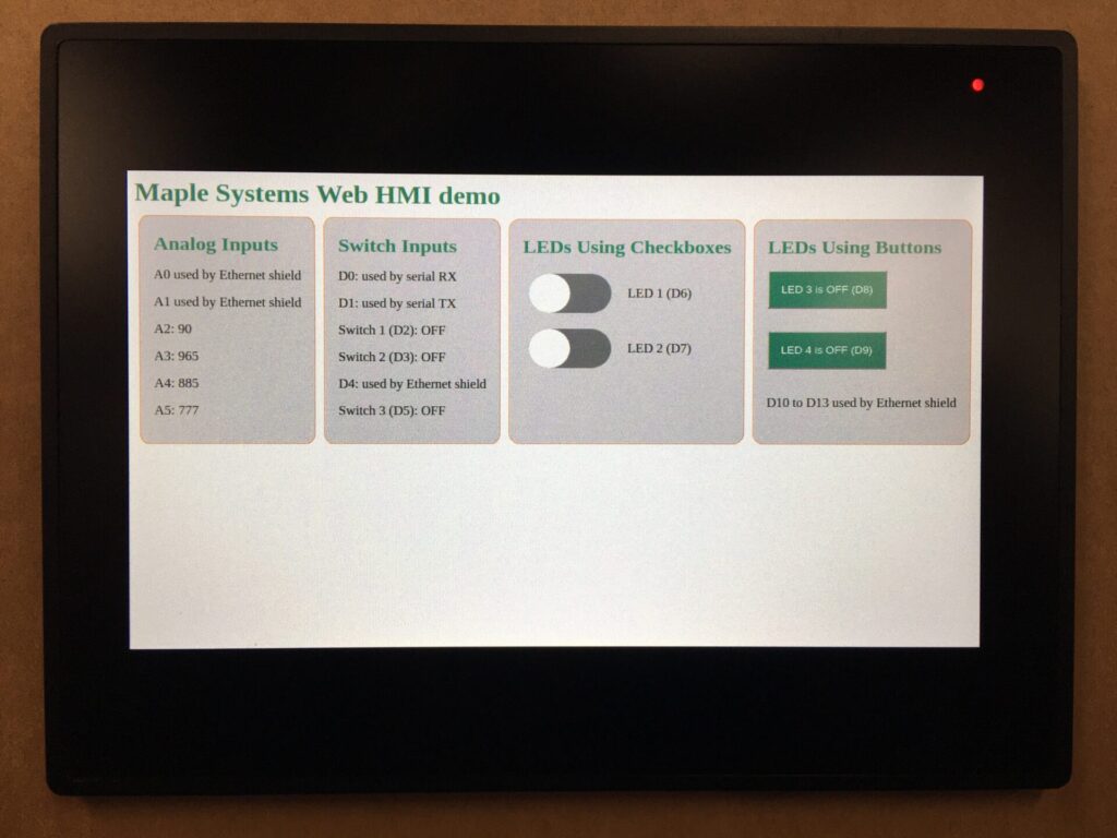 Maple Systems Web HMIs can connect to a web server hosted by a microcontroller such as an Arduino. In this example, the Web HMI’s integrated browser is used to control GPIO outputs on an Arduino microcontroller with an Arduino Ethernet Shield 2.