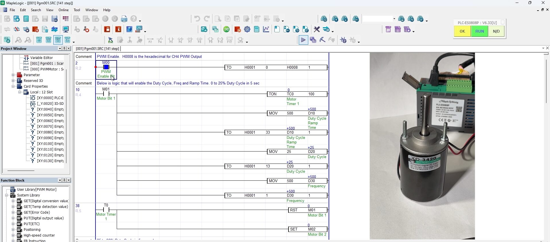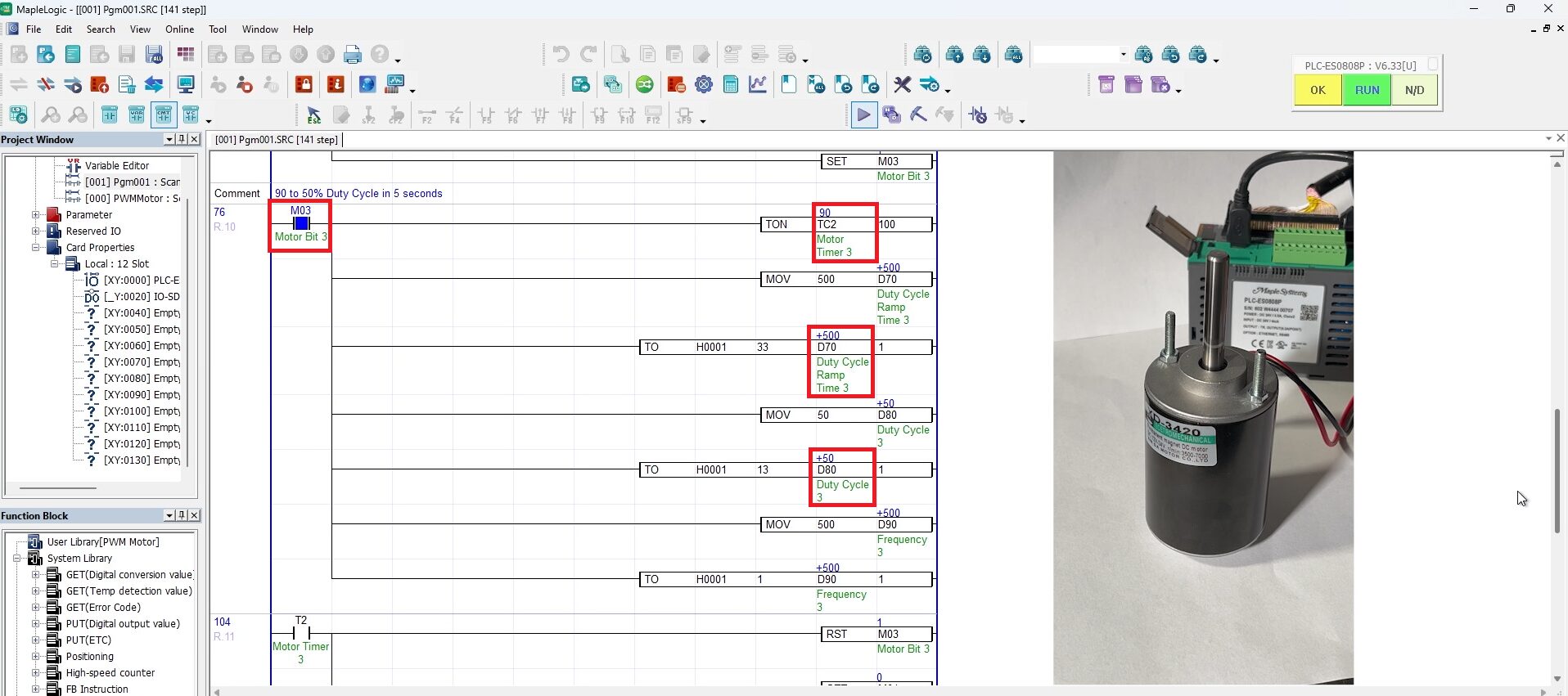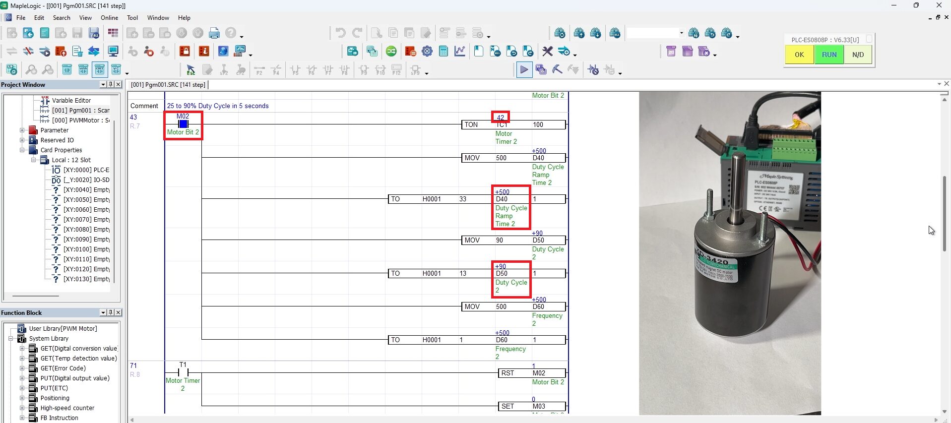 After downloading the project, go online with the PLC and PWM module to watch the motor respond to each duty cycle stage in real time.
