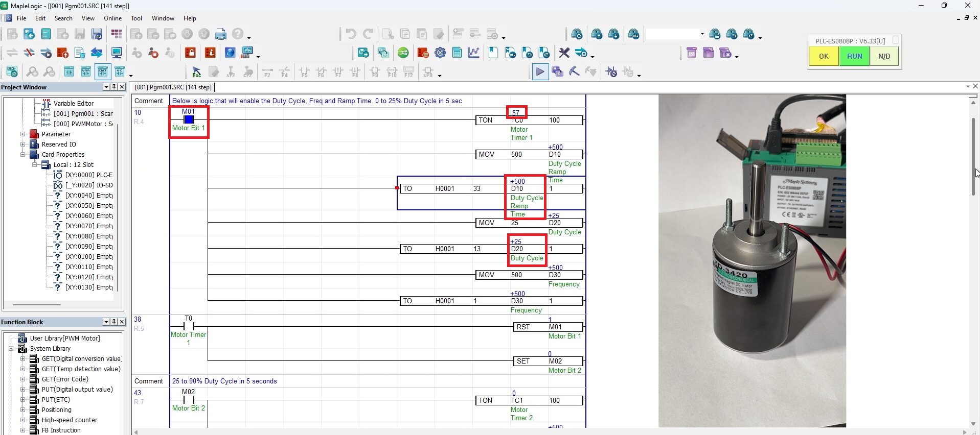 Click the M01 bit and press Shift + Enter to turn M01 ON. This enables the TON TC0 100 instruction. The motor ramps from 0% to 25% duty cycle at 500 Hz over 5 seconds, and after 10 seconds T0 turns ON, resets M01, and sets M02.