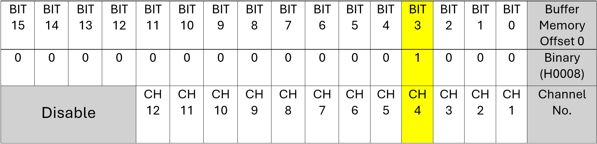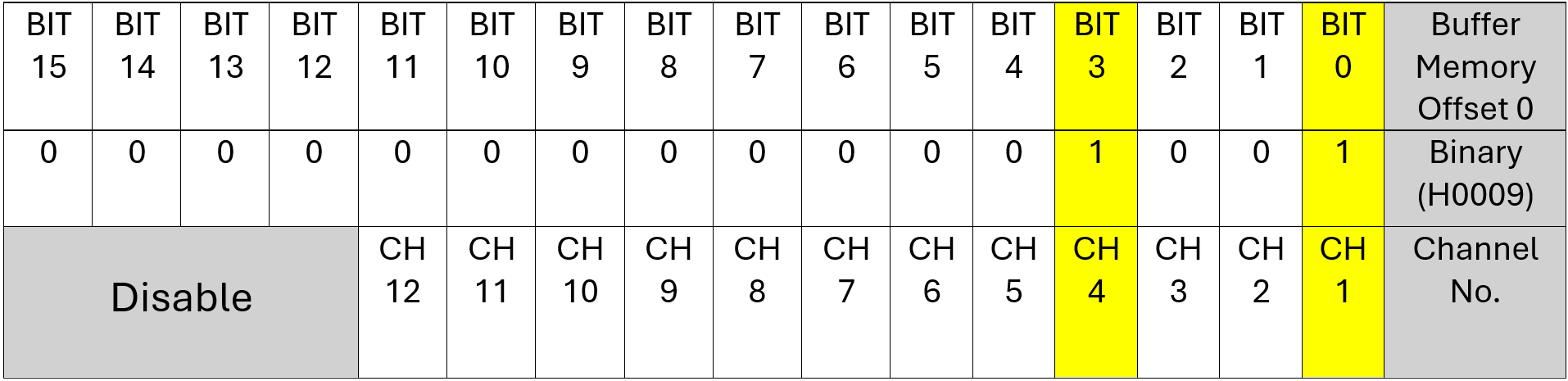 If you want to enable more than one channel, combine the bit values in binary and convert them to hexadecimal. For example, Channels 4 and 1 equal H0009, while Channels 8, 4, and 1 equal H0089.