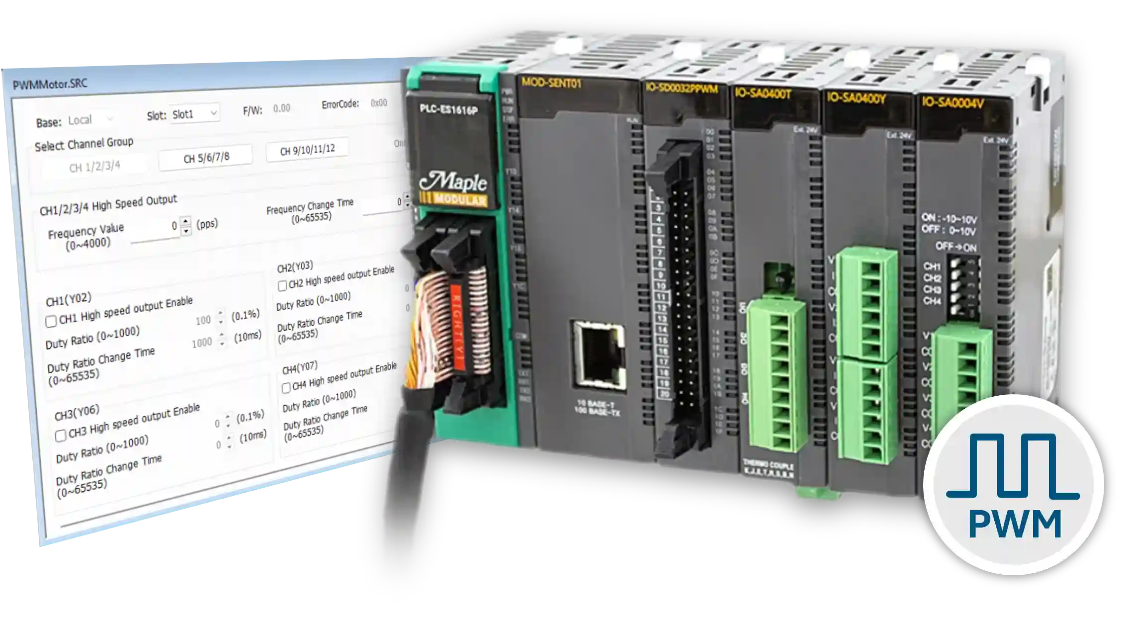 This example does not use the PWM Configuration GUI. Instead, ladder diagram logic in MapleLogic controls the PWM module.