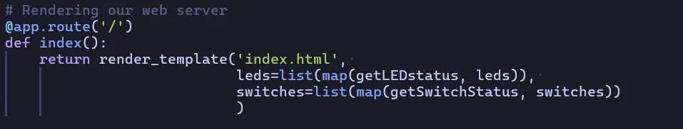 From here, we create a route for the “homepage” of the web server (also known as “/”), where we render the “index.html” template, and pipe in our LED and Switch arrays