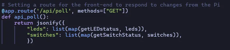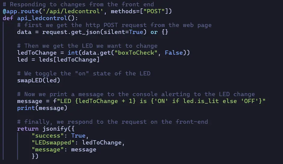 The next route we create is one to respond to LED changes from the front-end. The front end will send Flask a message of which LED it’s going to change, and this route changes the status of that LED