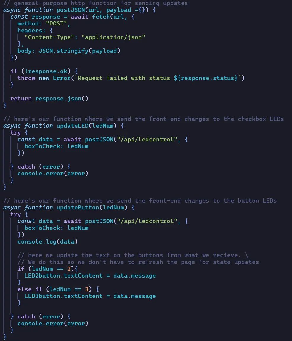 Now we’ll create some JavaScript functions that will respond to when the user presses any of the buttons associated with our LEDs, and send those changes back to our Flask server.