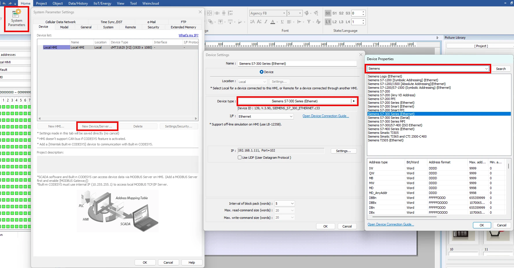 In the System Parameters window, click New Device/Server and select the Siemens S7-300 Ethernet driver.
