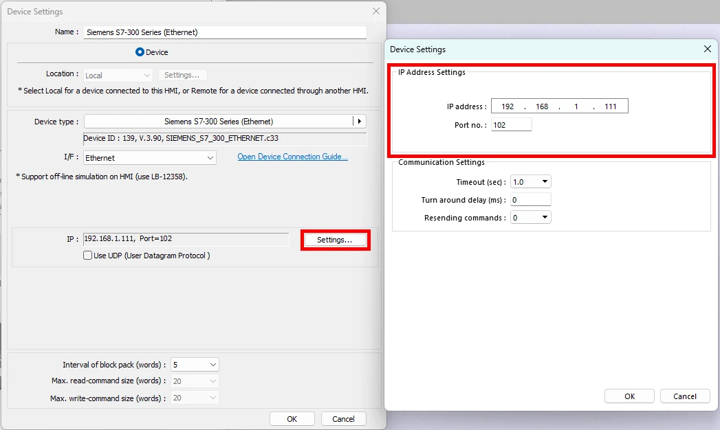 Open the settings menu to configure the communication settings for the Siemens PLC. These settings must match the configuration settings for the PLC or communication errors may occur. Once these are set, press OK to confirm.