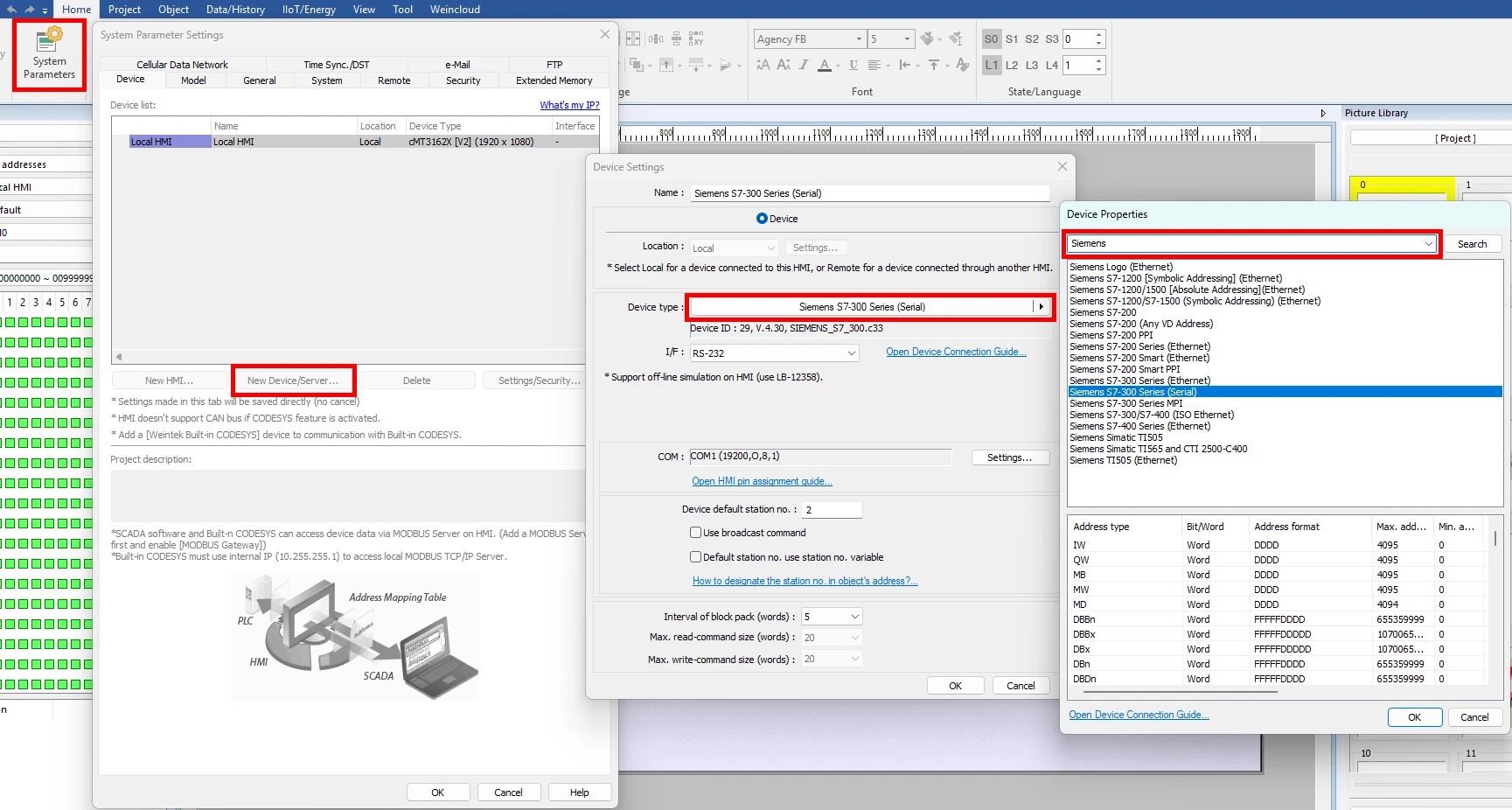 In the System Parameters window, click New Device/Server and select the Siemens S7-300 Serial driver.