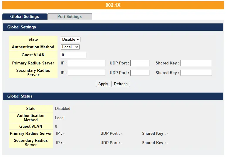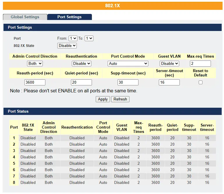 | Reset to Default | Select this and click Apply to reset the custom 802.1x port authentication settings back to default. |