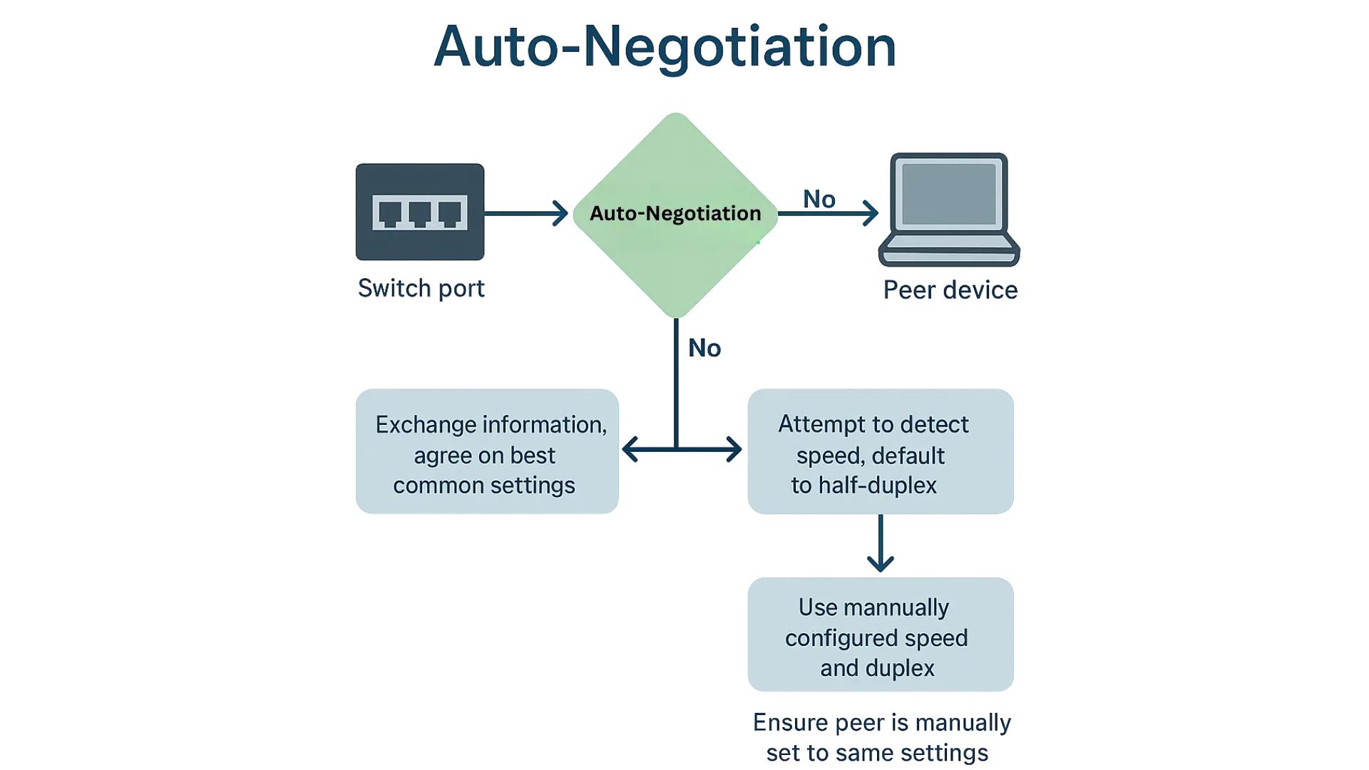 When auto-negotiation is enabled, the switch port and the peer device exchange information to agree on the best common settings. If the peer device does not support auto-negotiation or has it disabled, the switch port will attempt to detect the speed based on the signal but will default to half-duplex mode.