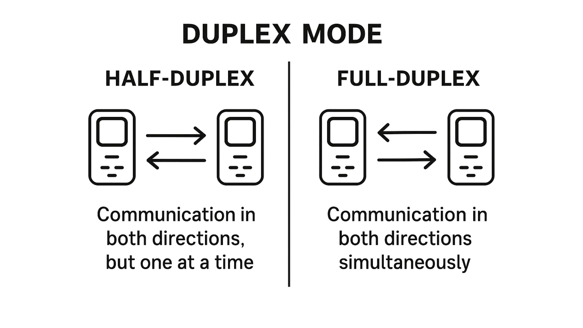 Duplex mode – A duplex communication system is a system composed of two connected parties or devices that can communicate with one another in both directions.