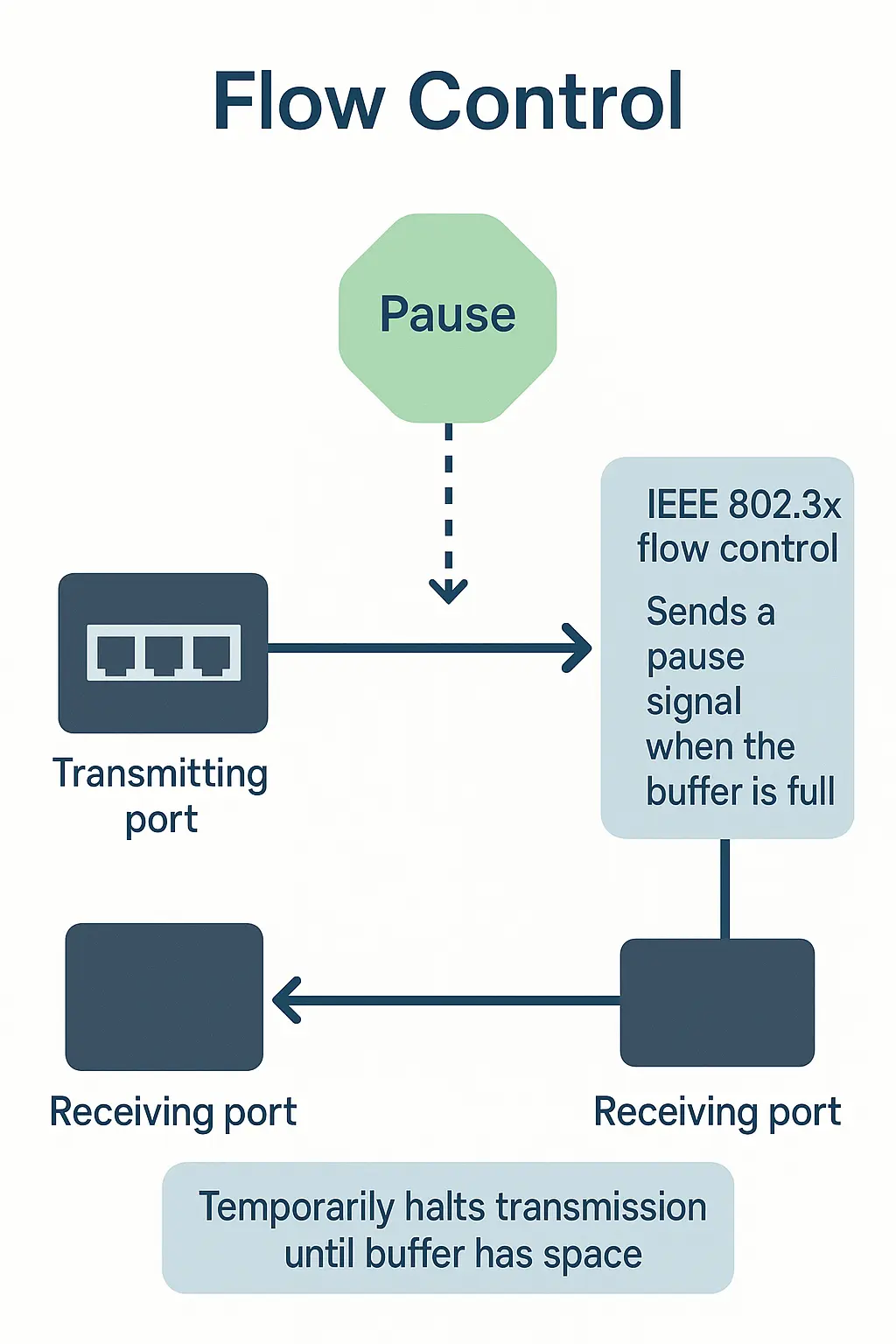 A high concentration of traffic on a port can reduce bandwidth and overflow the port’s buffer memory, resulting in packet drops and frame loss. IEEE 802.3x flow control, used in full-duplex mode, helps prevent this by sending a pause signal to the transmitting port when the receiving port’s buffer becomes full. This temporarily halts transmission until the buffer has space again, allowing data to be resent later.
