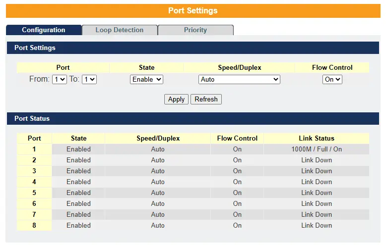 – The default port Speed & Duplex is auto for all ports.