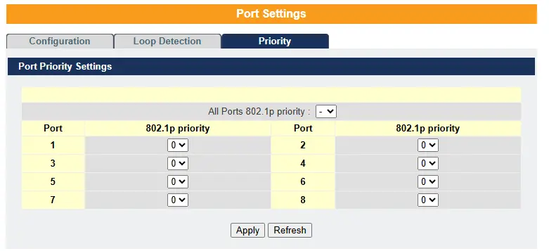 Under 802.1p priority settings, you can select a priority level for packets received on the port. This priority will only be applied to packets that do not already have an 802.1p priority tag.